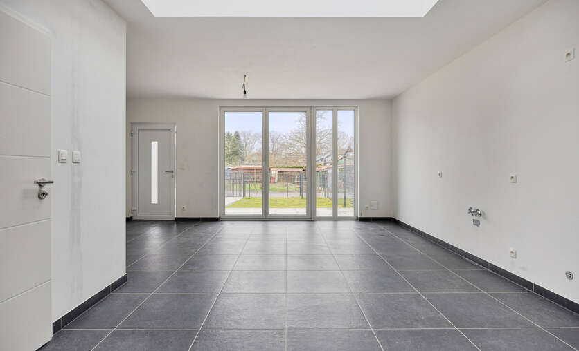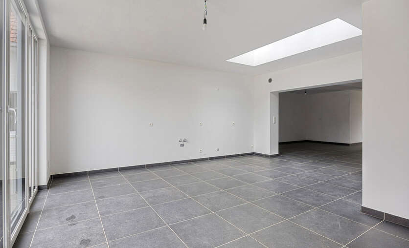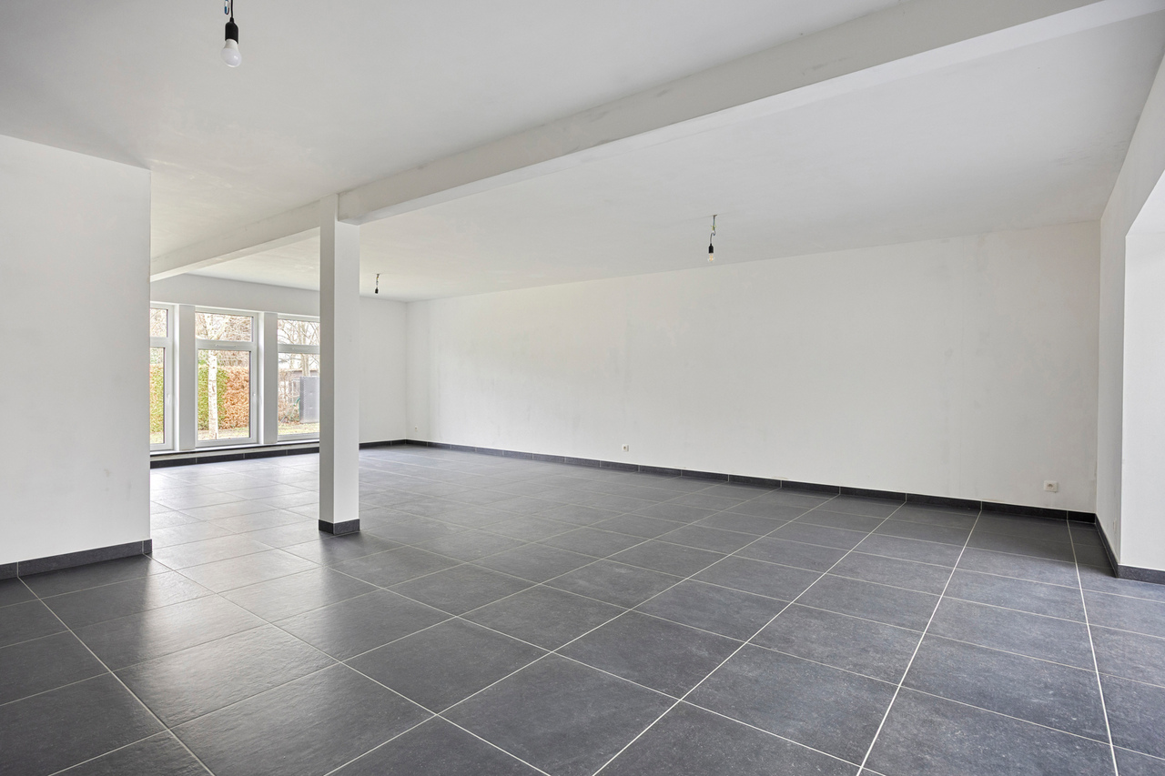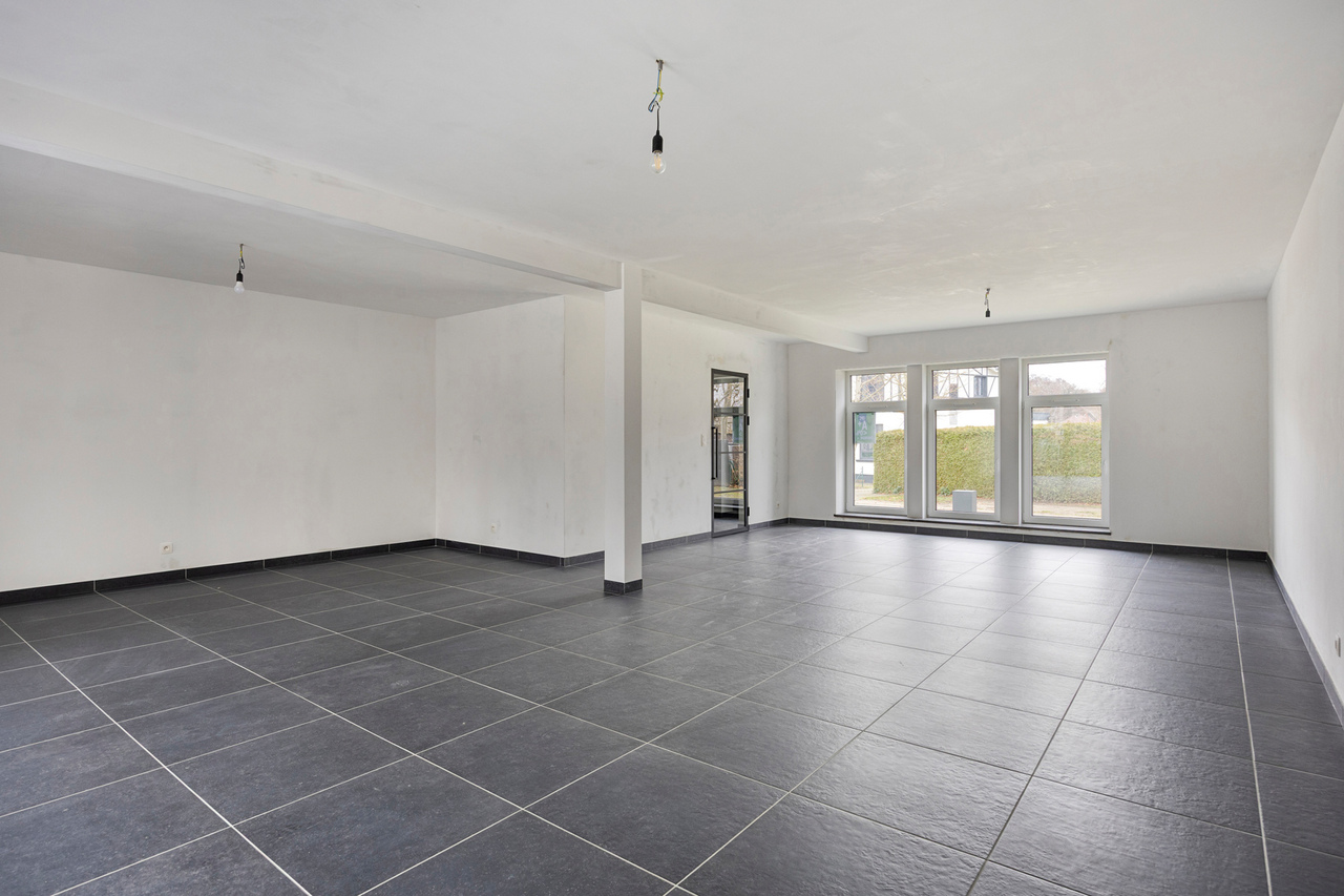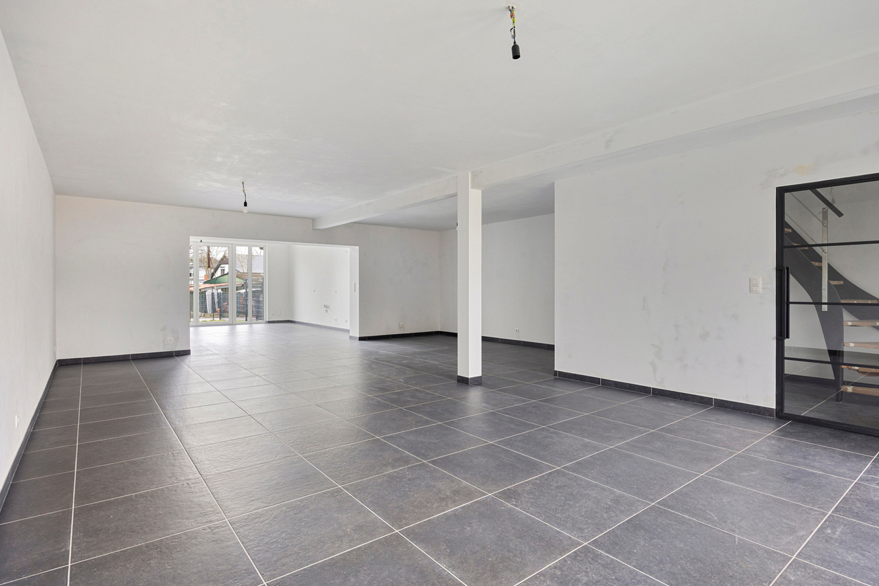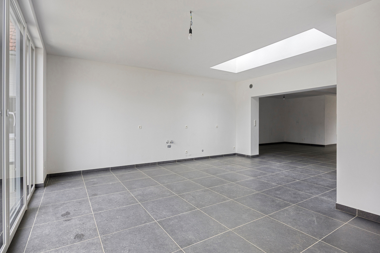 Bij het betreden van de woning komt u binnen in de inkomhal, waar zich de trap naar de eerste verdieping bevindt, evenals een afzonderlijk gastentoilet. Vanuit de inkomhal bereikt u de zeer ruime leefruimte via een zwarte metalen deur met glaspartijen. Achteraan zijn de aansluitingen voorzien om zelf een keuken te plaatsen; de keuken dient nog door de koper te worden geïnstalleerd. Boven de keuken zorgt een glazen lichtstraat voor een aangename en overvloedige lichtinval.