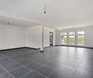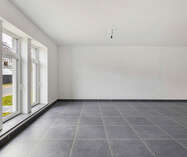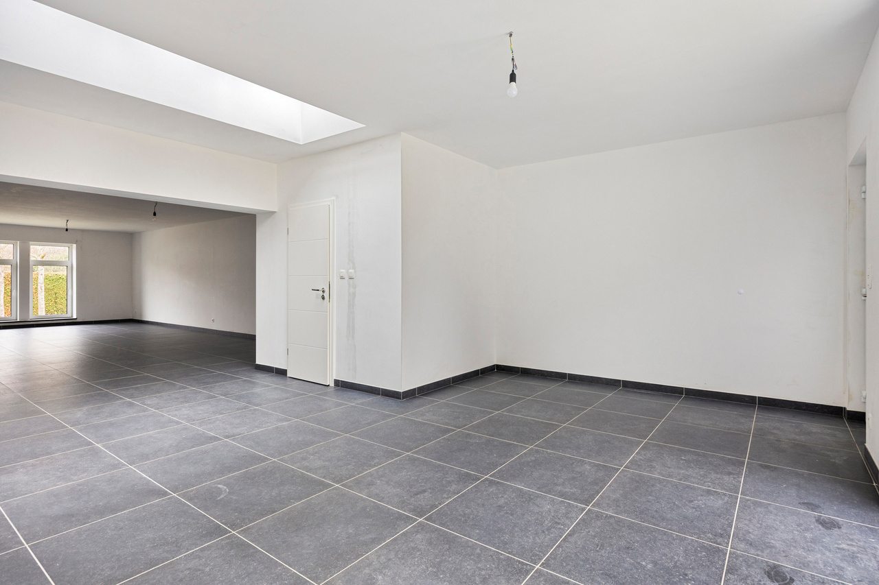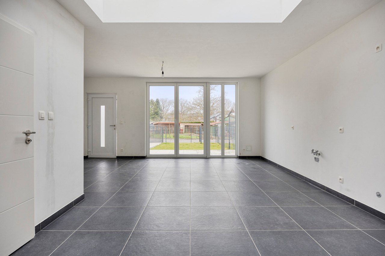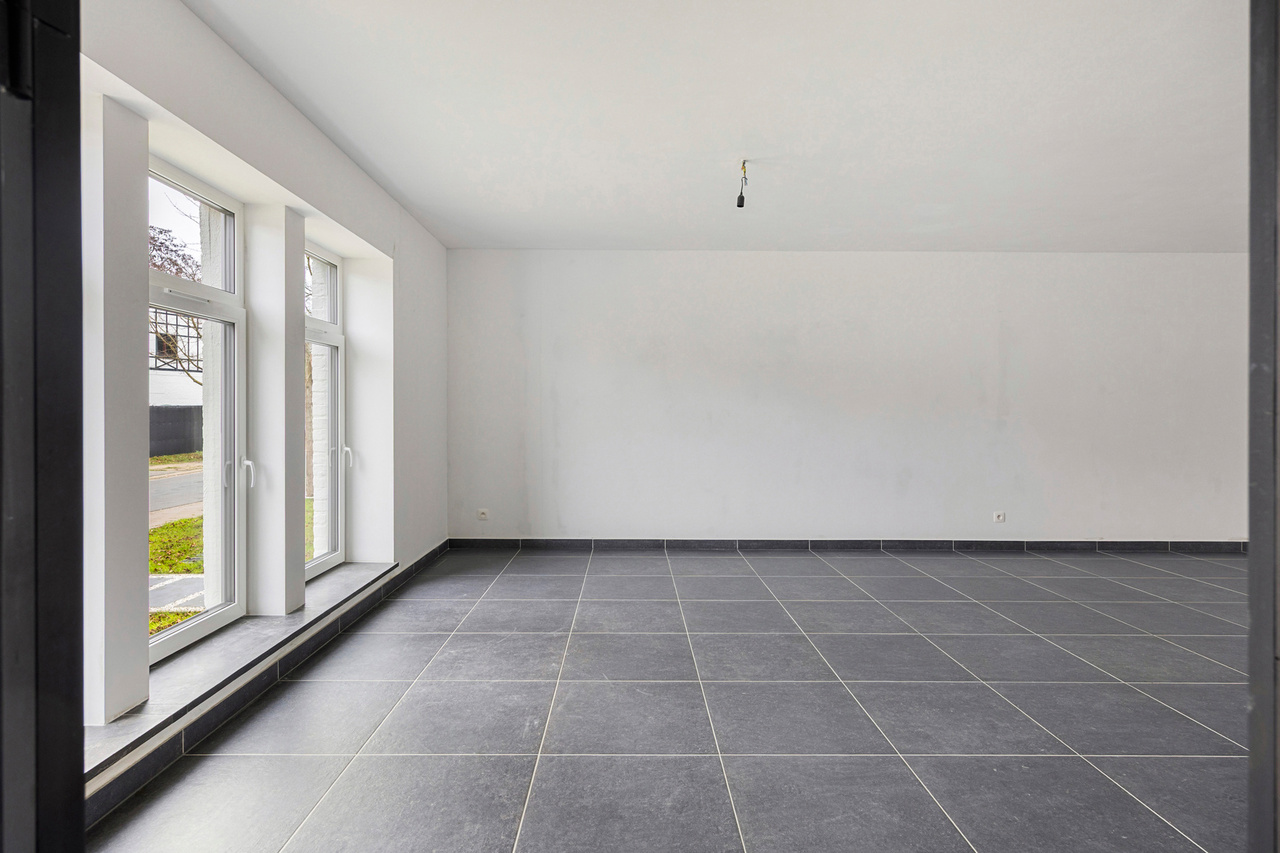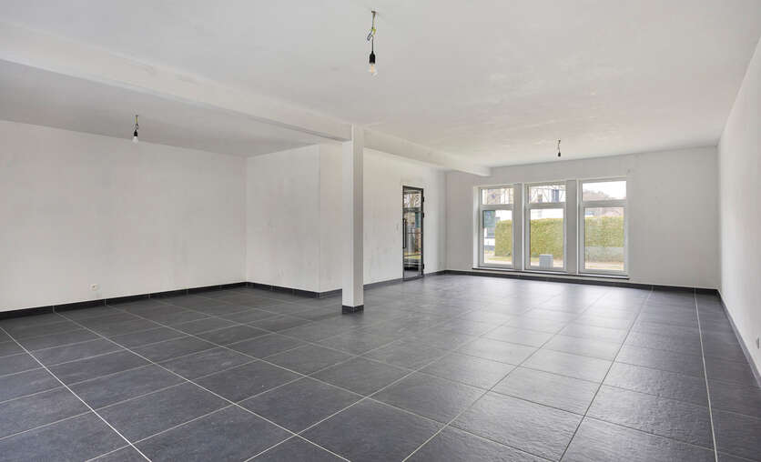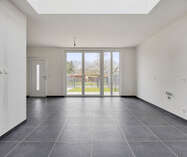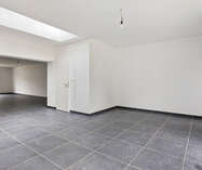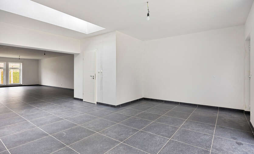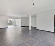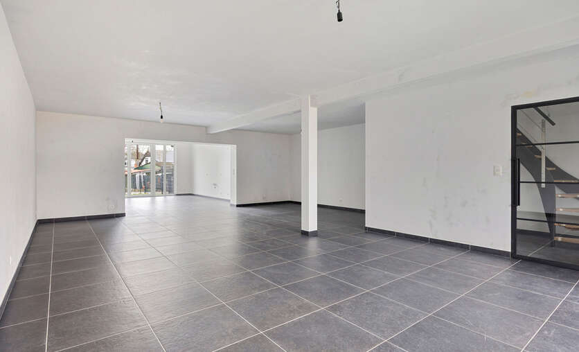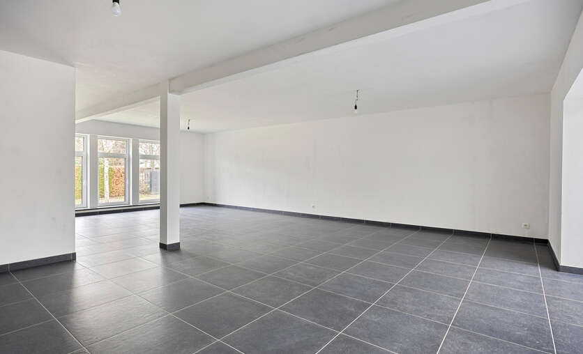 Bij het betreden van de woning komt u binnen in de inkomhal, waar zich de trap naar de eerste verdieping bevindt, evenals een afzonderlijk gastentoilet. Vanuit de inkomhal bereikt u de zeer ruime leefruimte via een zwarte metalen deur met glaspartijen. Achteraan zijn de aansluitingen voorzien om zelf een keuken te plaatsen; de keuken dient nog door de koper te worden geïnstalleerd. Boven de keuken zorgt een glazen lichtstraat voor een aangename en overvloedige lichtinval.