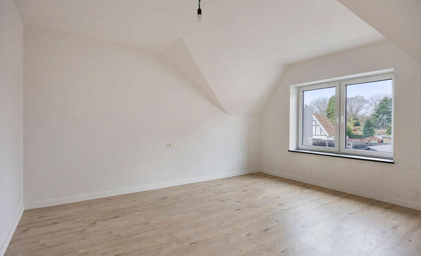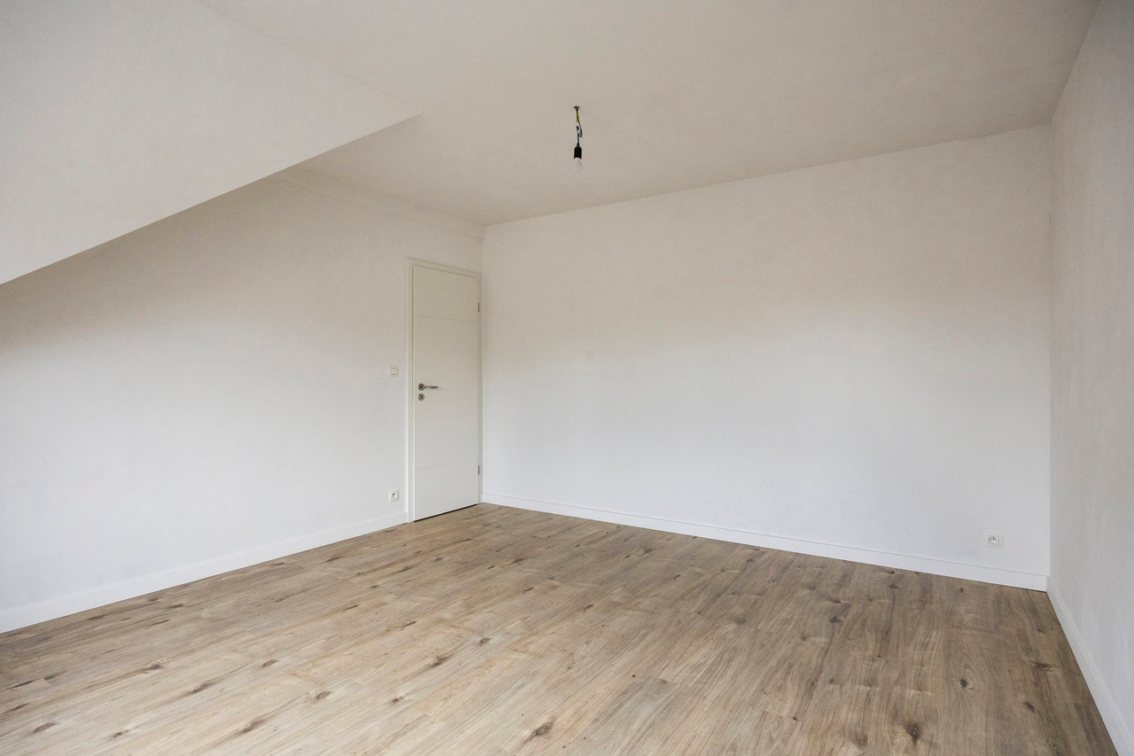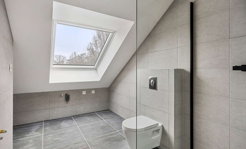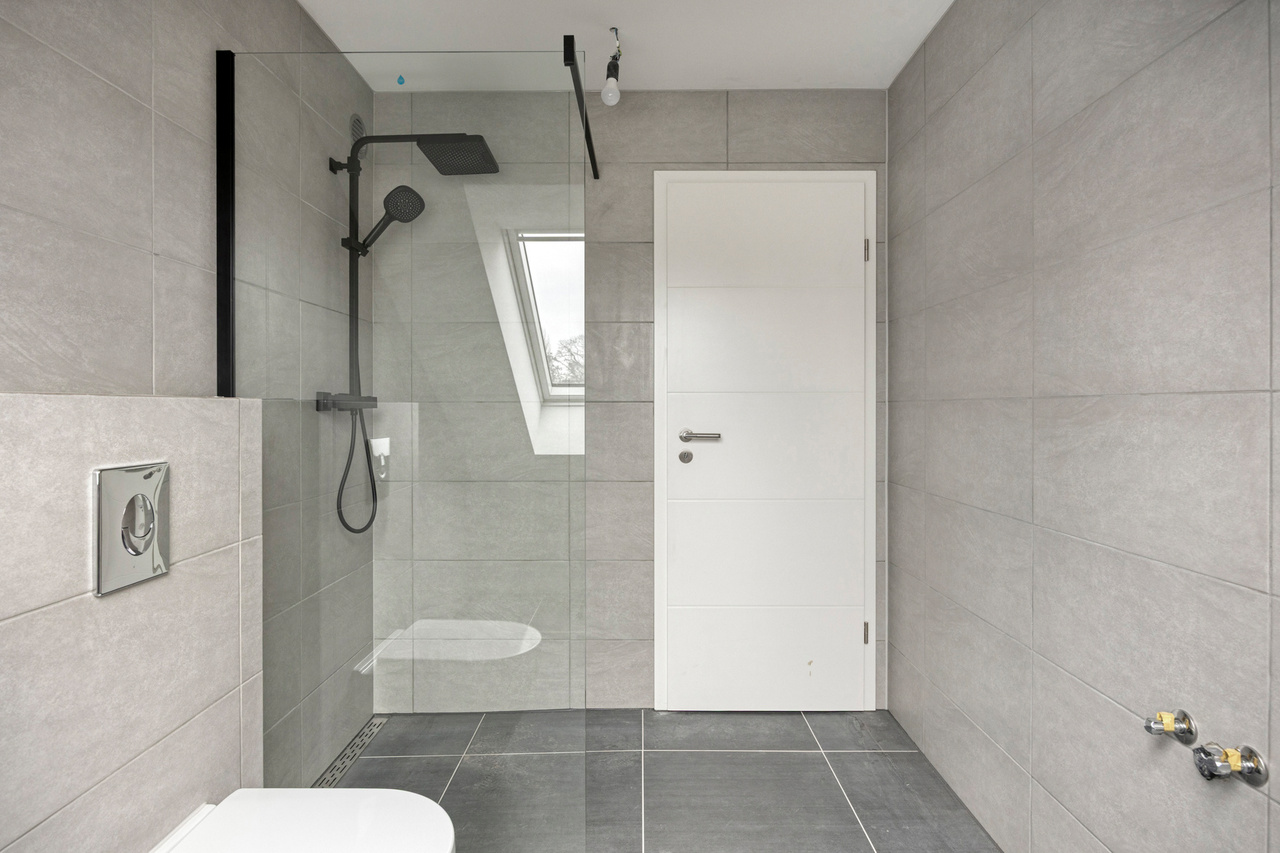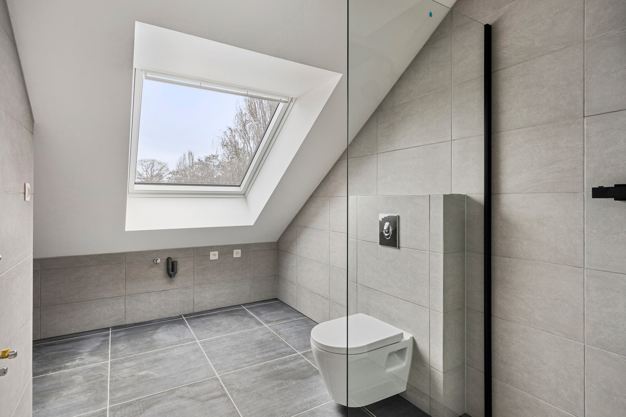 Op de eerste verdieping zijn er drie slaapkamers en een badkamer. De badkamer is uitgerust met een inloopdouche, een toilet en de nodige voorzieningen voor een badkamermeubel. Daarnaast is er ook een beperkte zolderberging aanwezig, bereikbaar via een uitschuifbare trap.