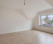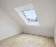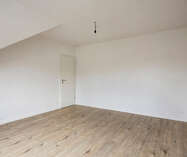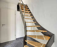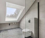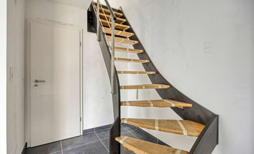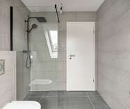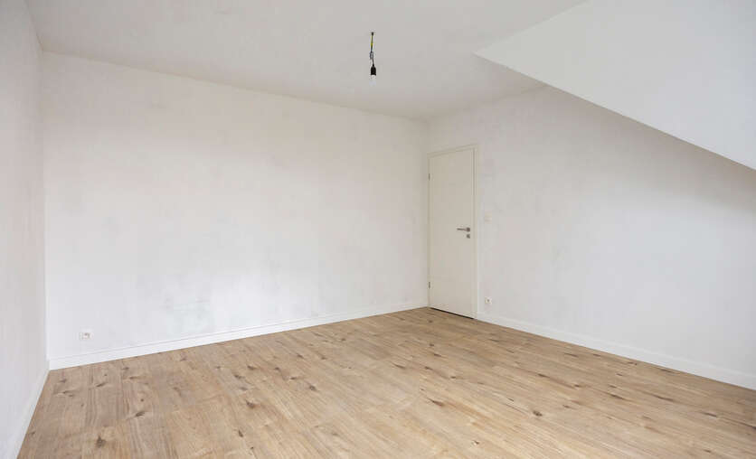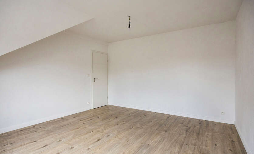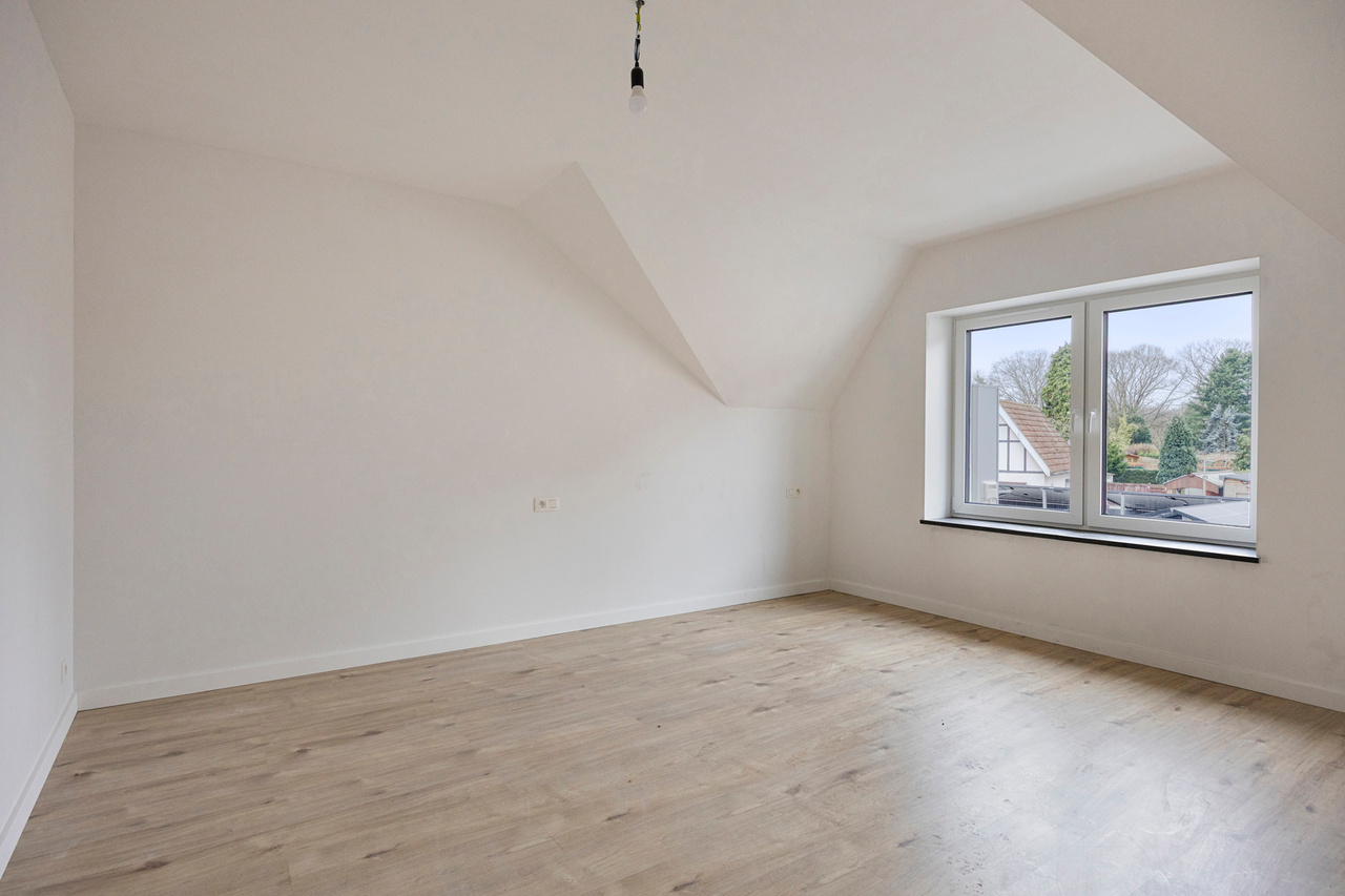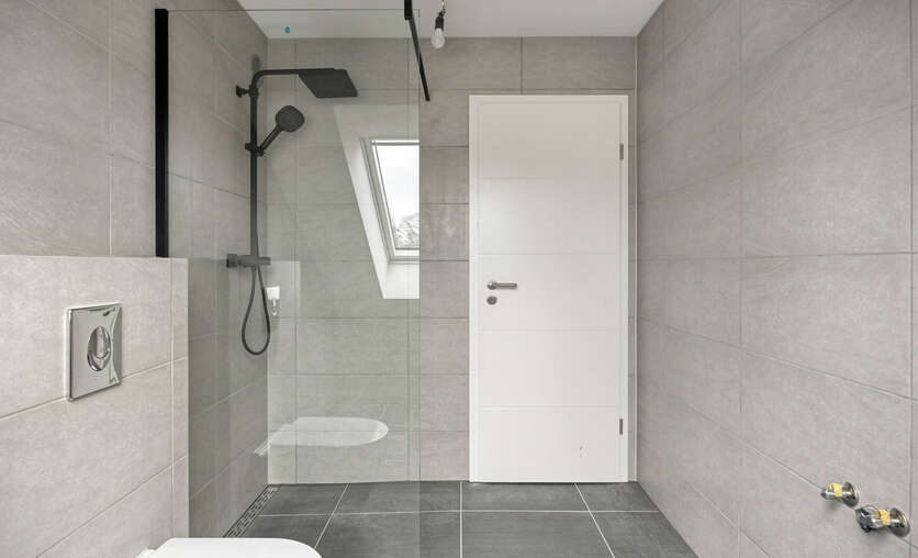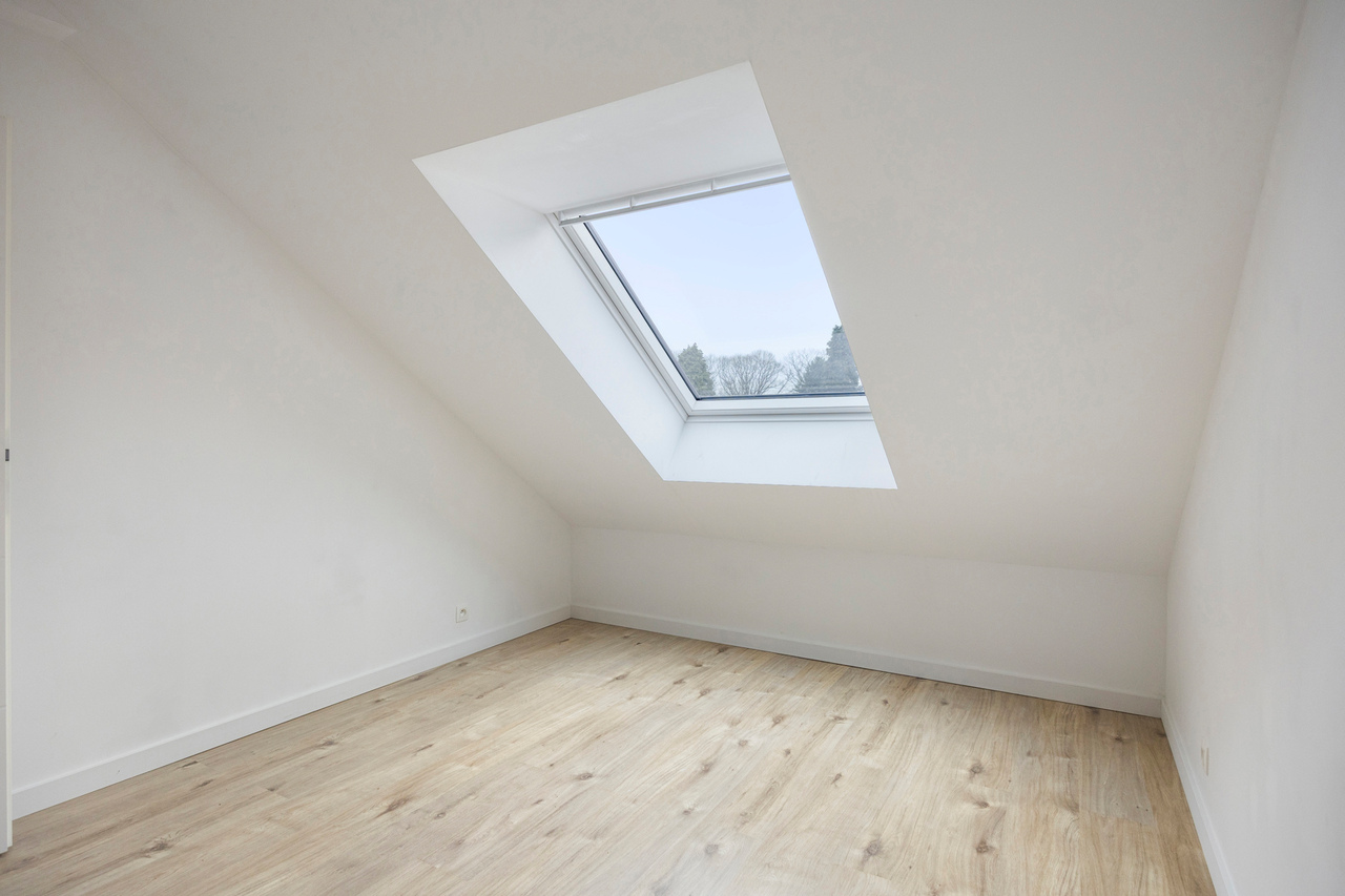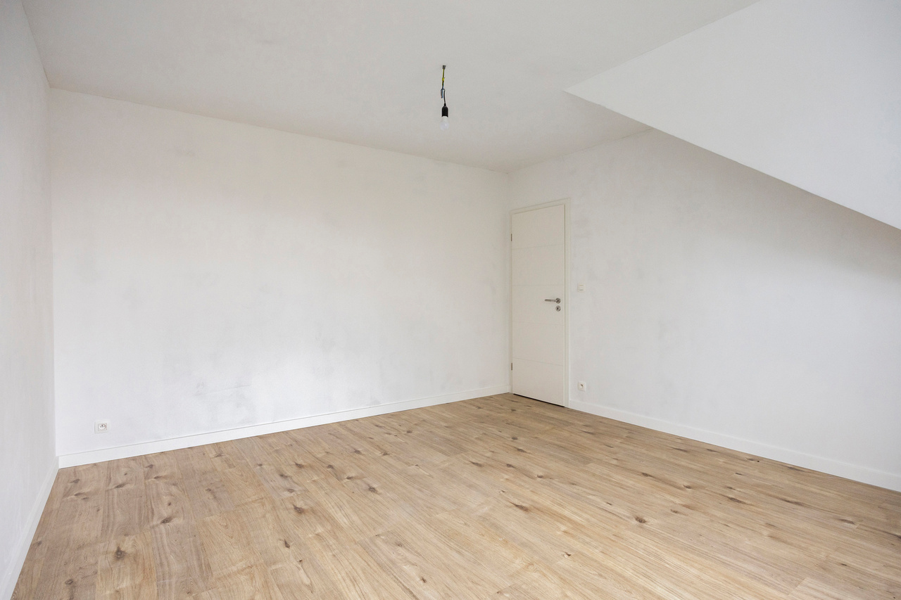 Op de eerste verdieping zijn er drie slaapkamers en een badkamer. De badkamer is uitgerust met een inloopdouche, een toilet en de nodige voorzieningen voor een badkamermeubel. Daarnaast is er ook een beperkte zolderberging aanwezig, bereikbaar via een uitschuifbare trap.