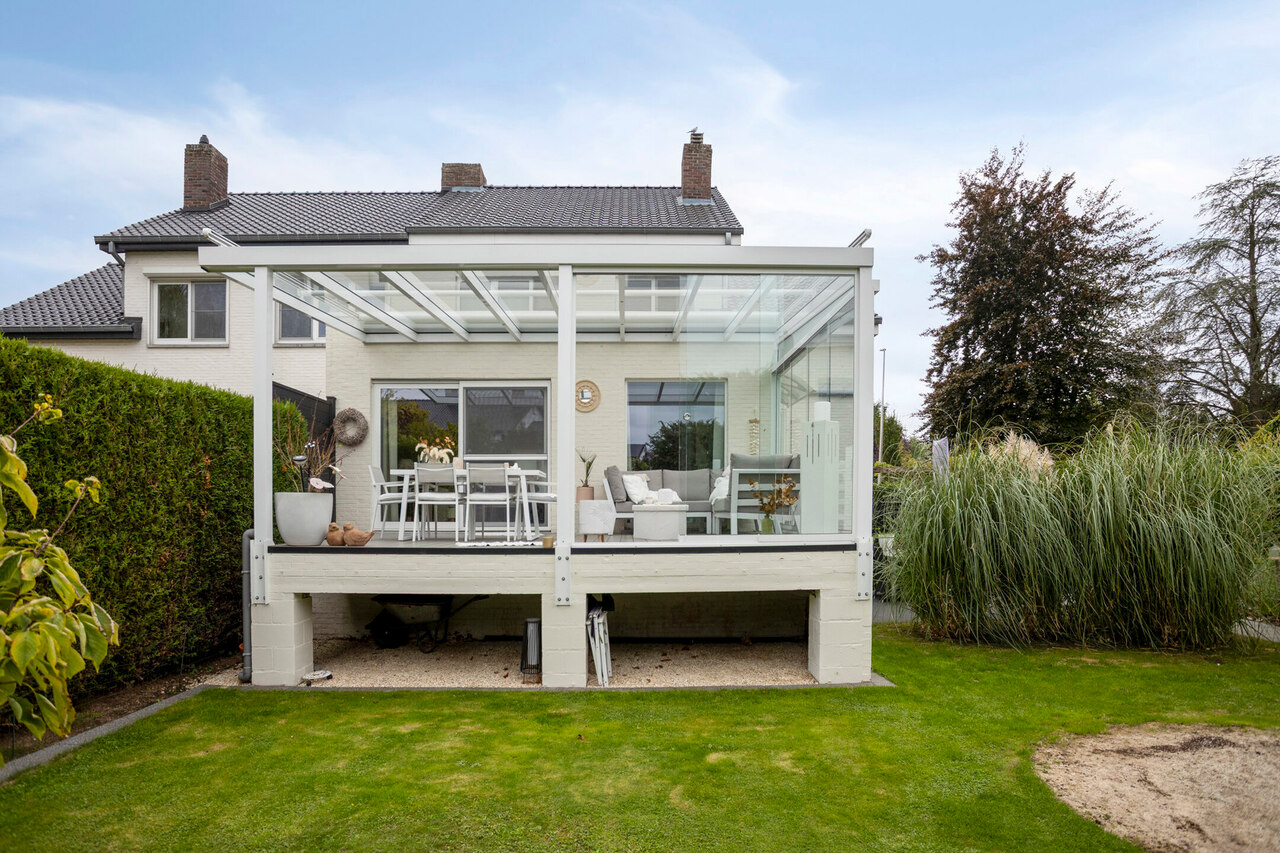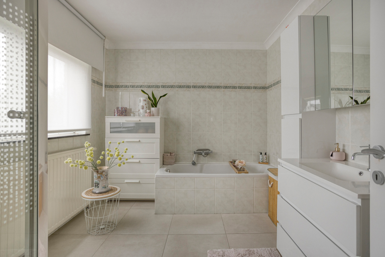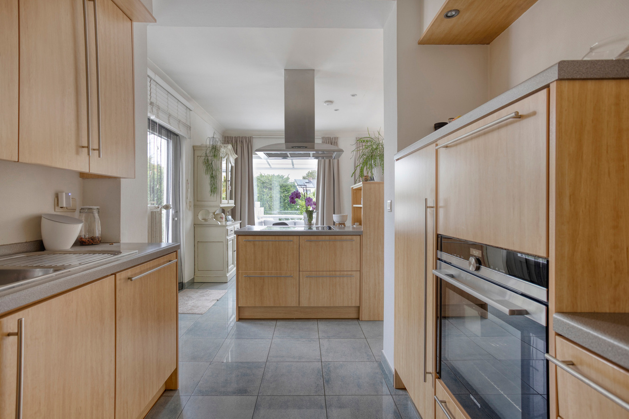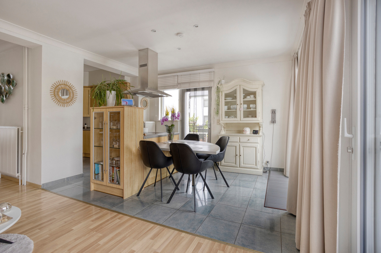 Bij het betreden van de woning komen we binnen in een gezellige hal die ons meteen doorleidt naar de ruime leefruimte. Dankzij de grote ramen aan de voor- en achterzijde geniet u hier de hele dag van veel natuurlijk licht. Aansluitend vinden we de keuken die volledig is uitgerust met een kookplaat, dampkap, ingebouwde oven, vaatwasser en koelkast. Achteraan de woning werd een mooie extra ruimte aangebouwd, voorzien van een zonnescreen, waardoor dit een ideale plek is om te genieten van extra wooncomfort.