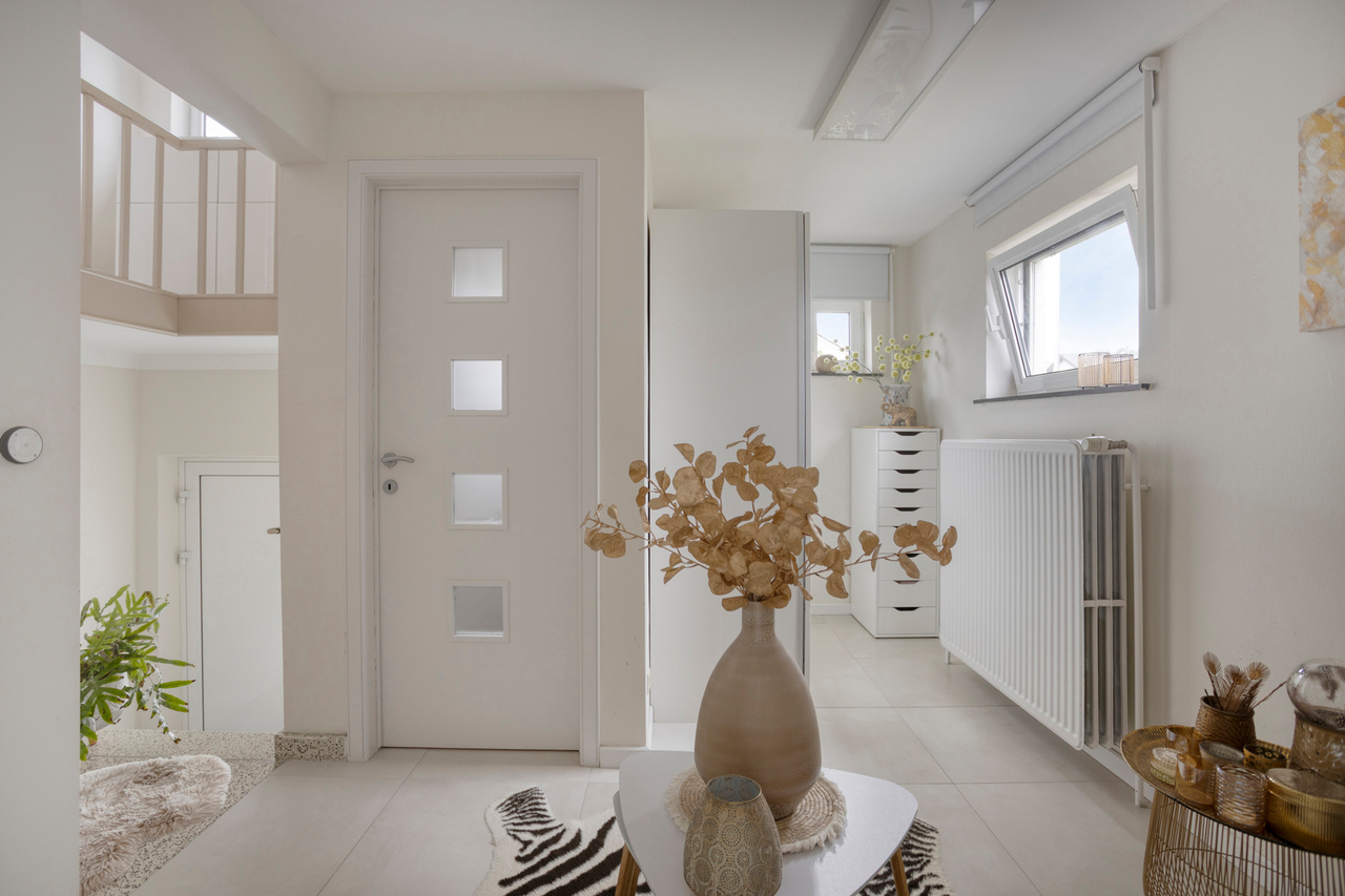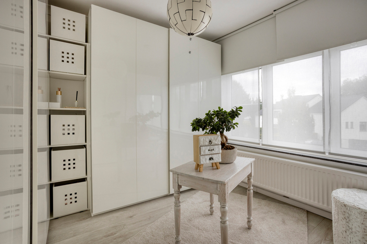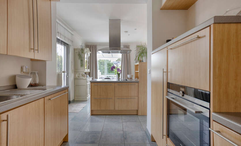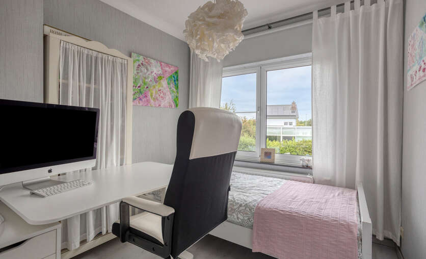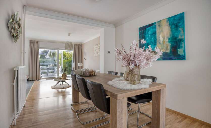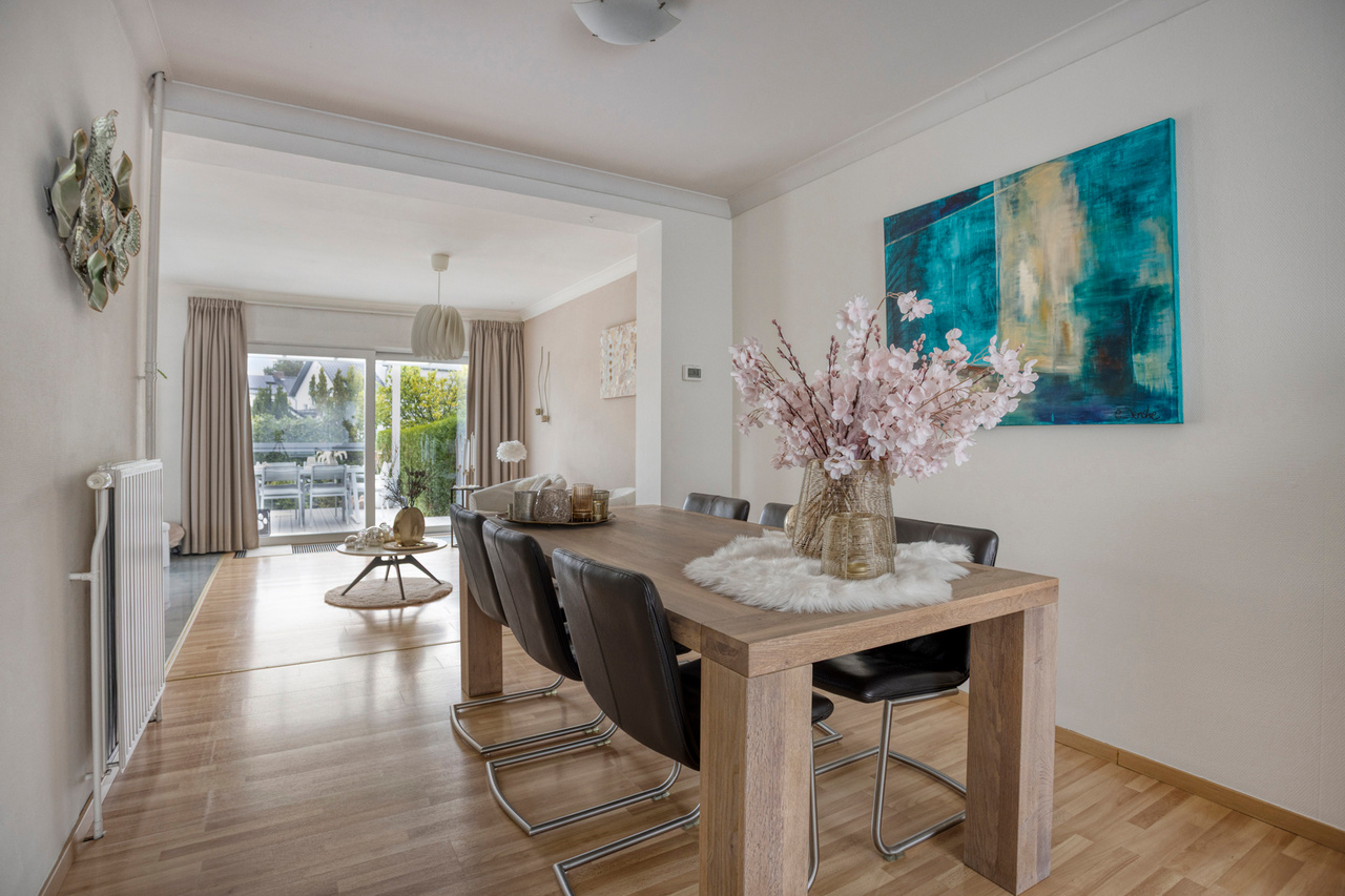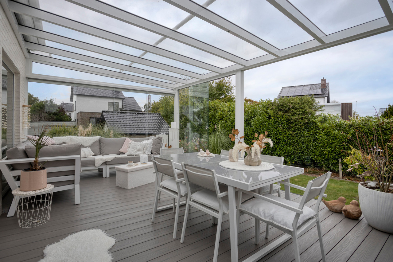 Bij het betreden van de woning komen we binnen in een gezellige hal die ons meteen doorleidt naar de ruime leefruimte. Dankzij de grote ramen aan de voor- en achterzijde geniet u hier de hele dag van veel natuurlijk licht. Aansluitend vinden we de keuken die volledig is uitgerust met een kookplaat, dampkap, ingebouwde oven, vaatwasser en koelkast. Achteraan de woning werd een mooie extra ruimte aangebouwd, voorzien van een zonnescreen, waardoor dit een ideale plek is om te genieten van extra wooncomfort.
