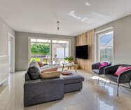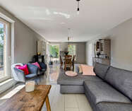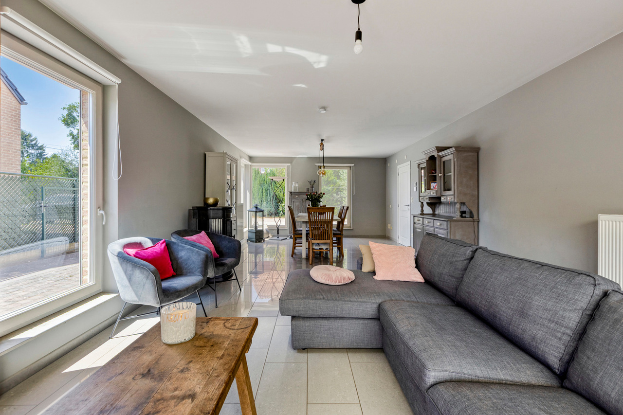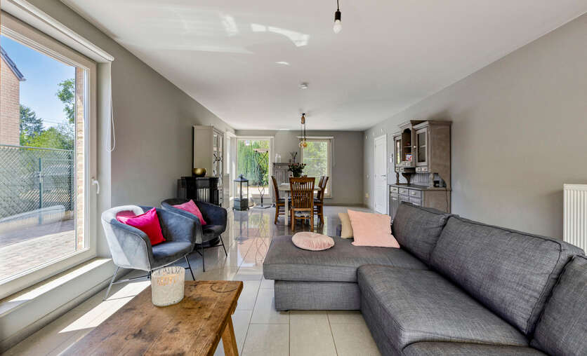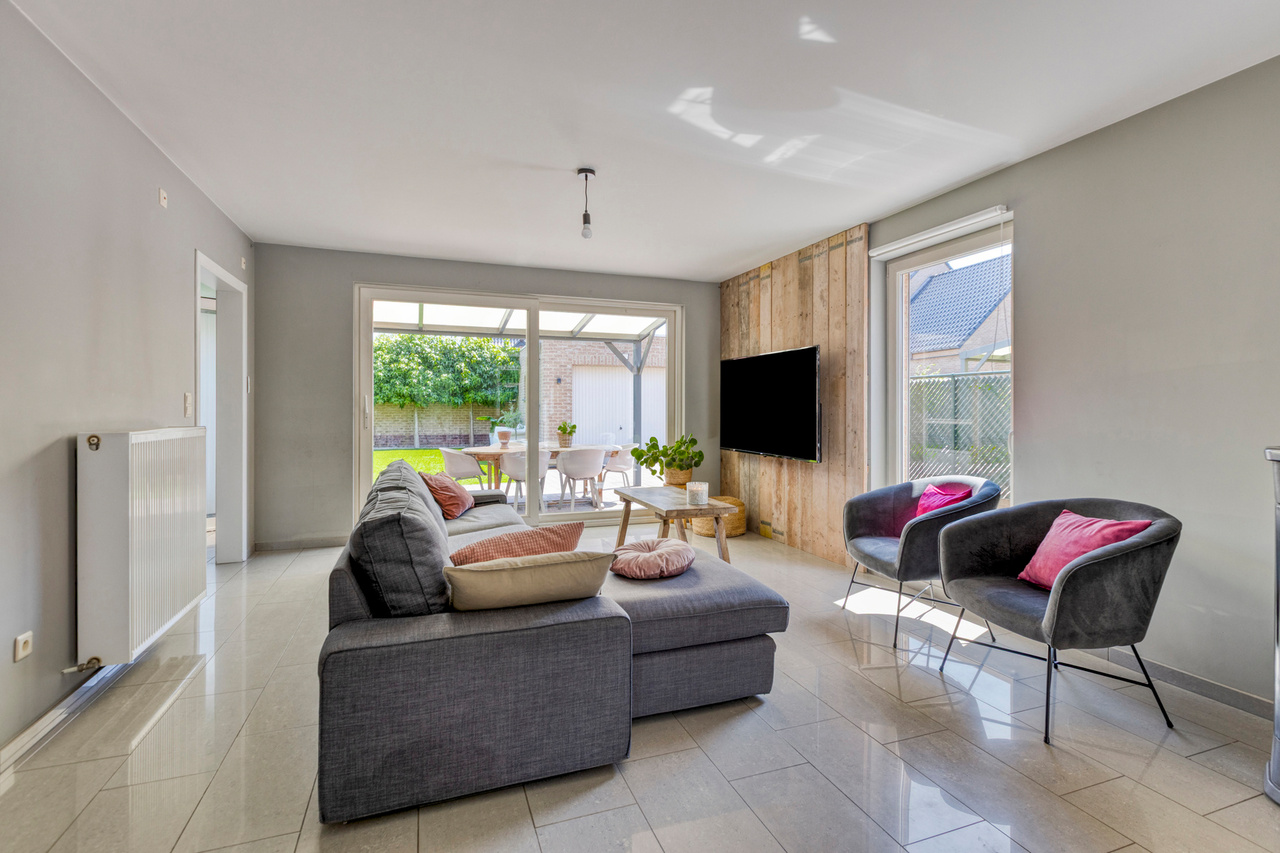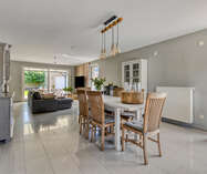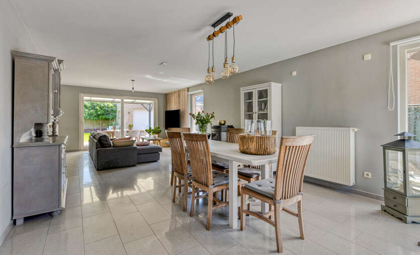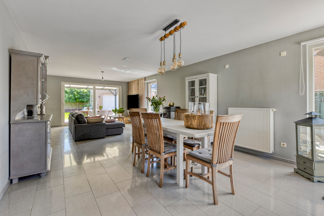 Van hieruit bereiken we de ruime en lichtrijke leefruimte, voorzien van grote raampartijen die zorgen voor een aangename lichtinval. De pelletkachel draagt bij aan extra warmte en gezelligheid.