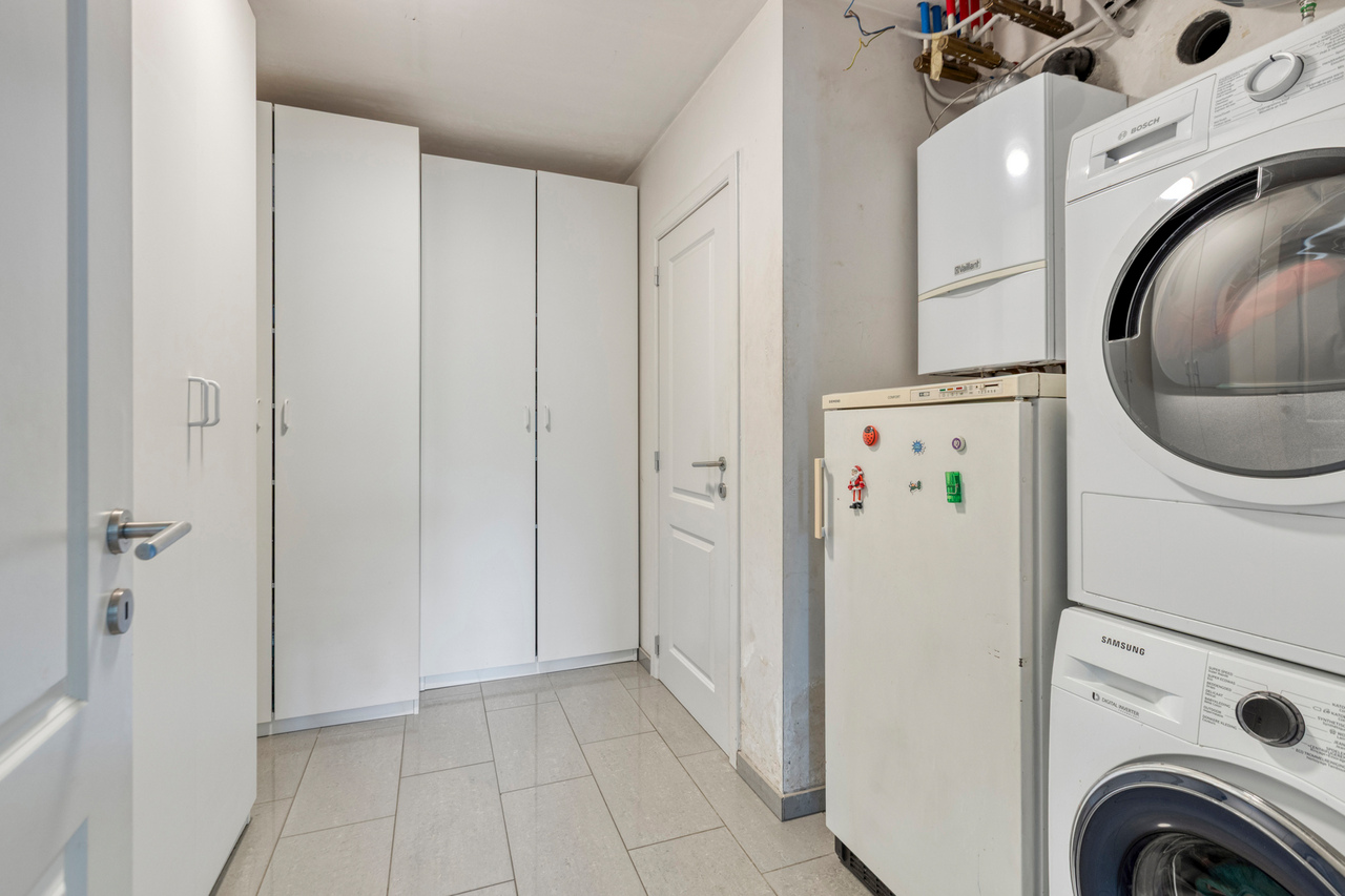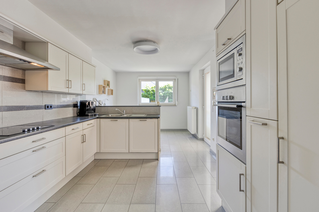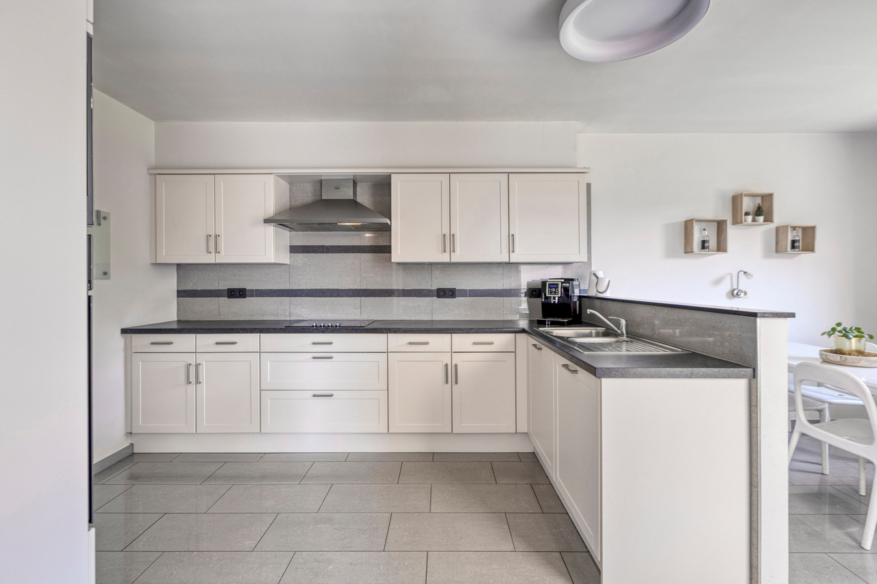 Aansluitend bevindt zich de volledig uitgeruste keuken, voorzien van alle nodige inbouwtoestellen: een vaatwasser, microgolfoven, heteluchtoven, koelkast, kookplaat en dampkap. Naast de keuken bevindt zich een handige bergruimte.