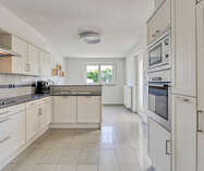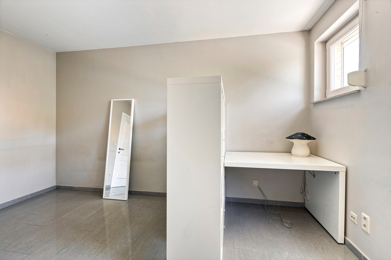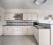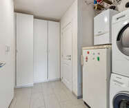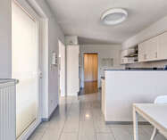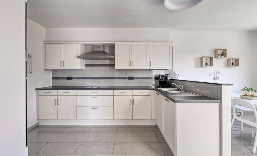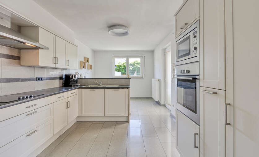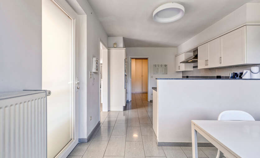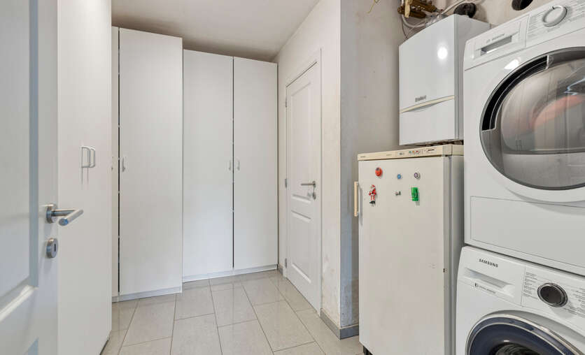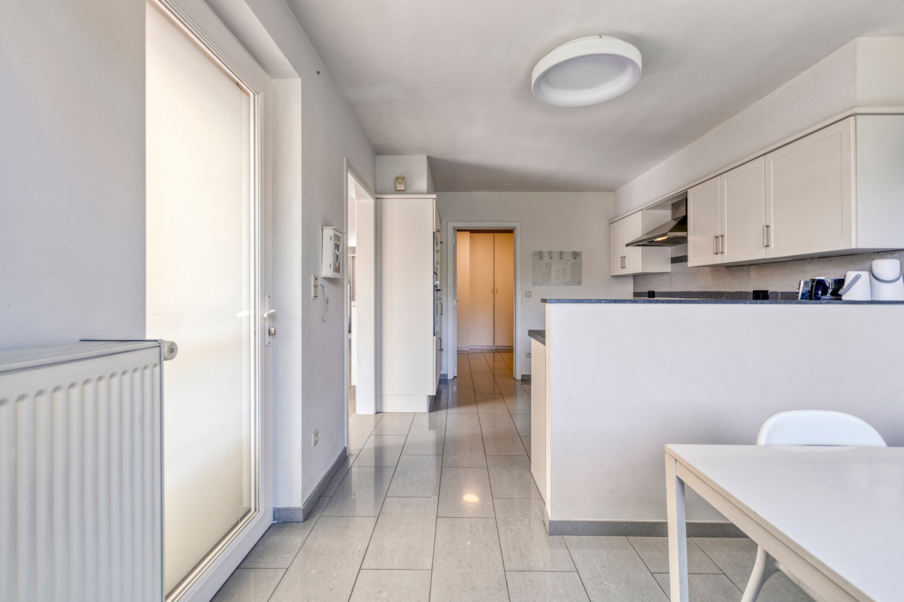 Aansluitend bevindt zich de volledig uitgeruste keuken, voorzien van alle nodige inbouwtoestellen: een vaatwasser, microgolfoven, heteluchtoven, koelkast, kookplaat en dampkap. Naast de keuken bevindt zich een handige bergruimte.