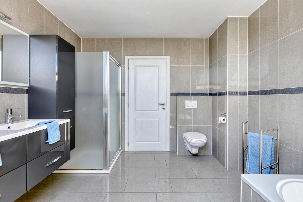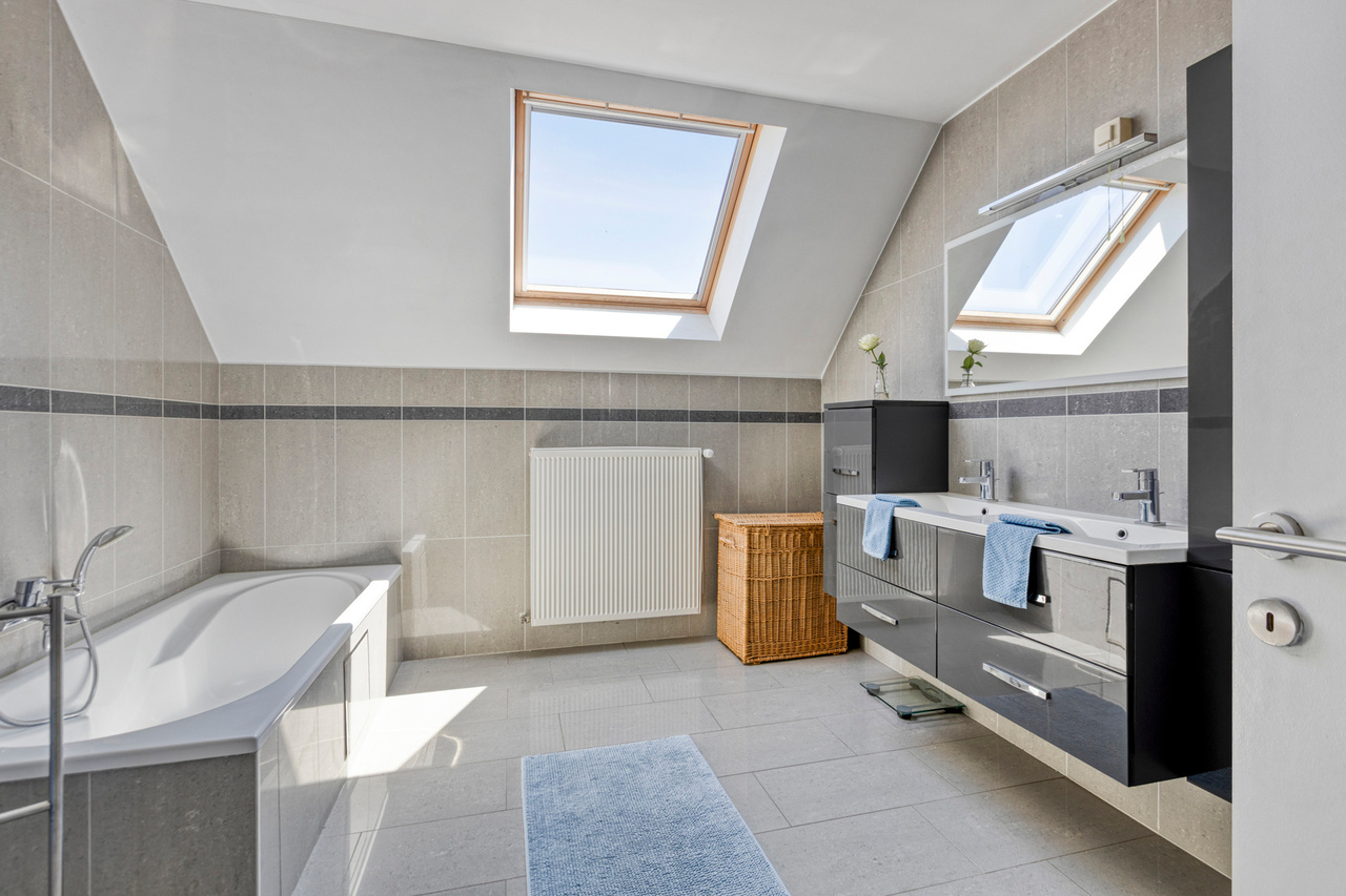 Op de eerste verdieping vinden we een ruime badkamer, ingericht met een douche, ligbad, lavabomeubel en tweede toilet. Er zijn op deze verdieping drie volwaardige slaapkamers. Via één van de slaapkamers krijgt men toegang tot de zolderverdieping.