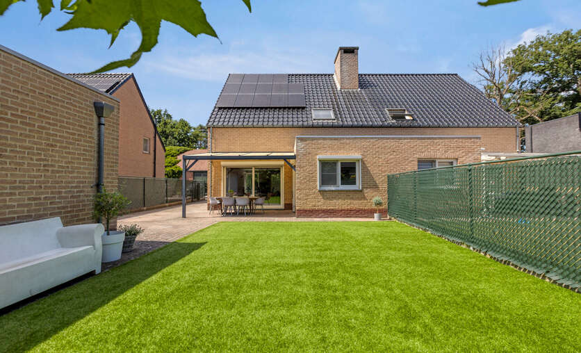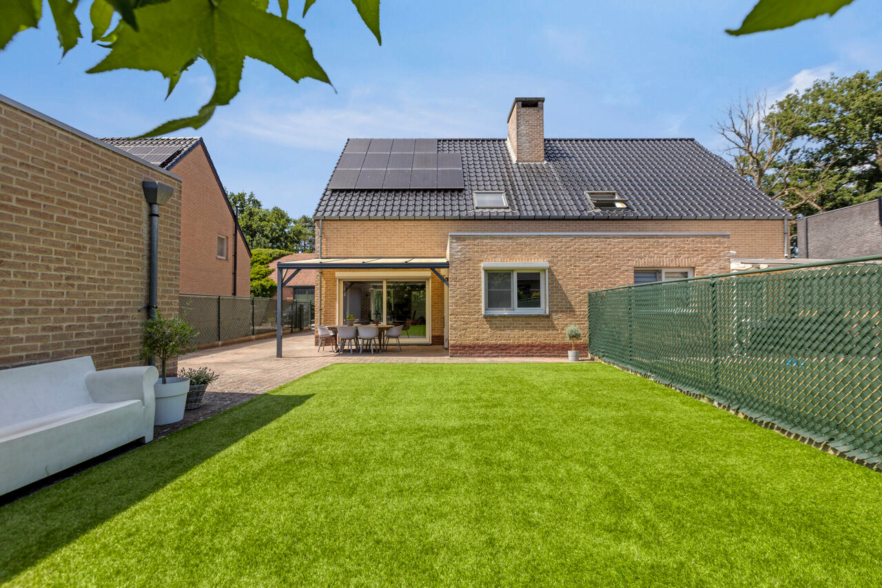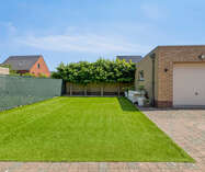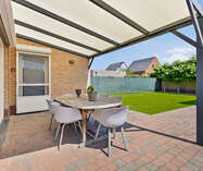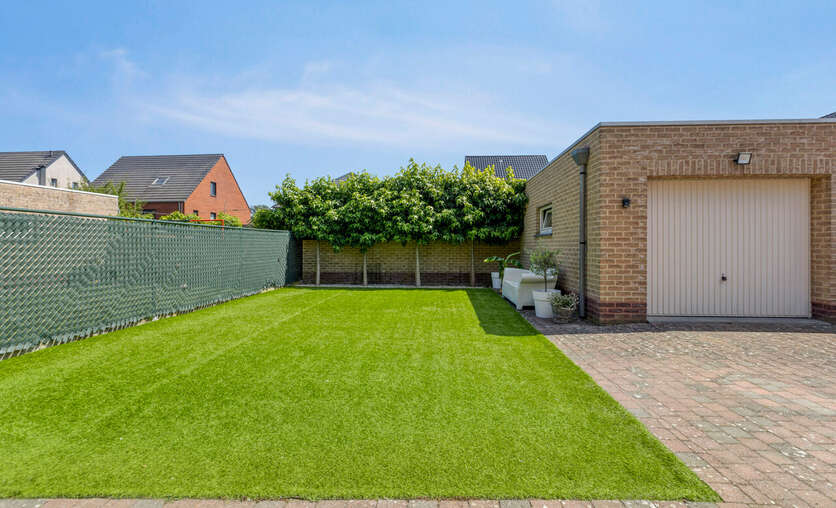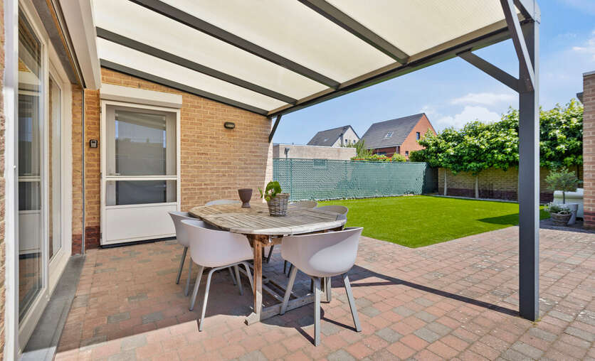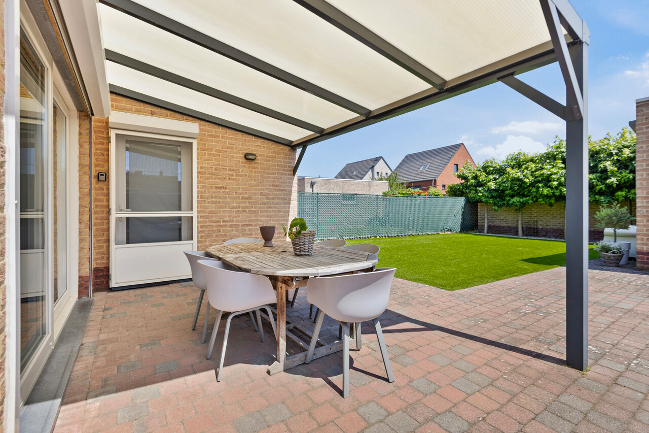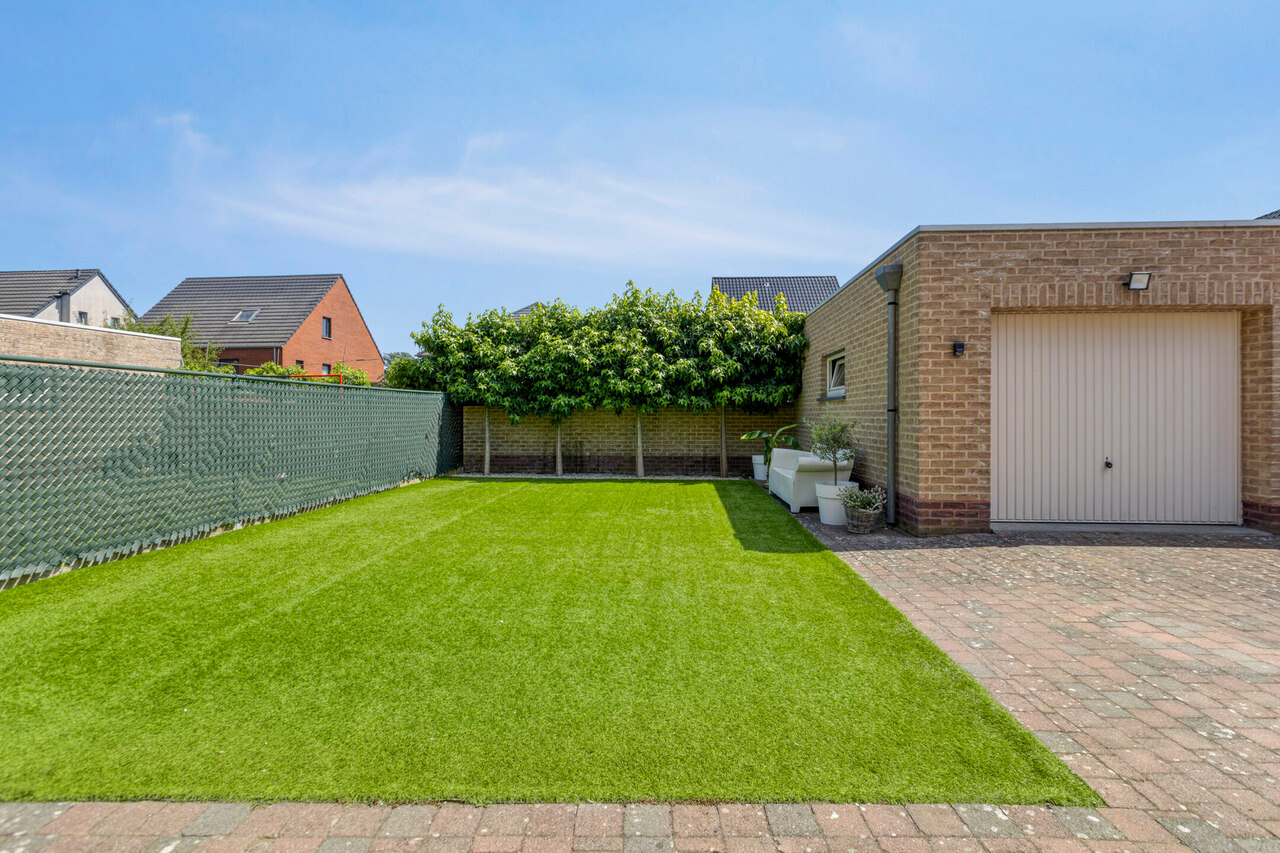 Buiten is er een overdekt terras (afdak) en een garage met automatische poort.