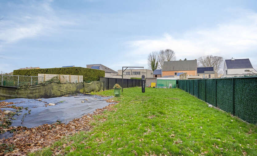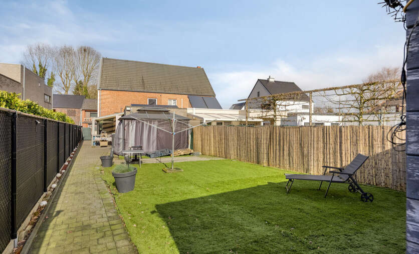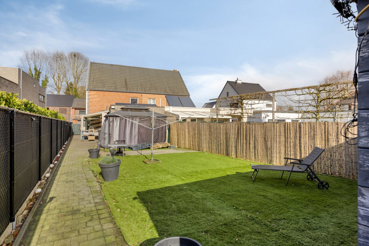 Achteraan een diepe, volledig omheinde tuin met graspartij, overdekt terras met pergola, paviljoen en tuinhuis. Verwarming via Viessmann-condensatieketel en pelletkachel. Zonnepanelen aanwezig. Verharde oprit vooraan.