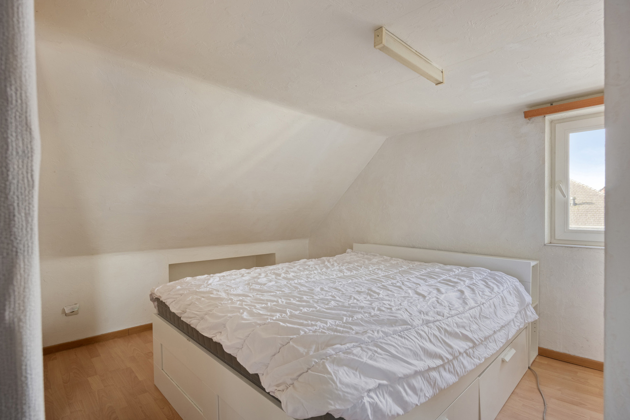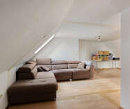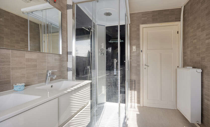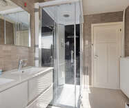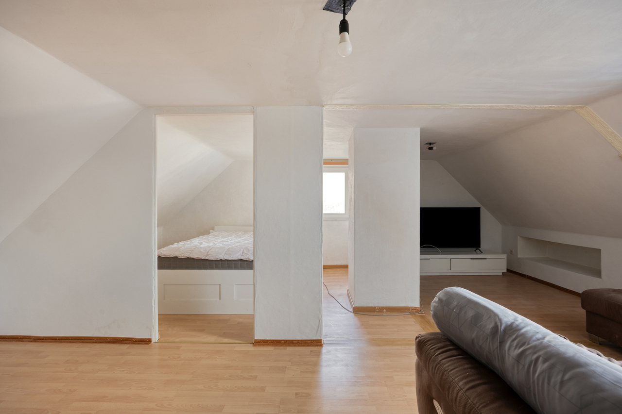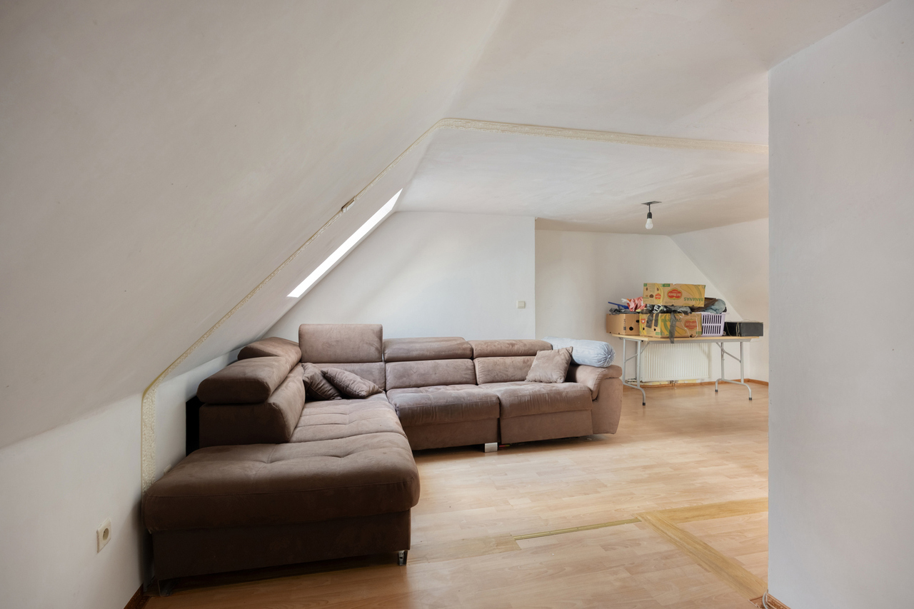 Op de eerste verdieping: twee ruime slaapkamers en een moderne badkamer met stoomcabine, regendouche, dubbele lavabo en toilet. De dakverdieping biedt een grote leefruimte met aansluitende slaapkamer en Velux-dakramen.