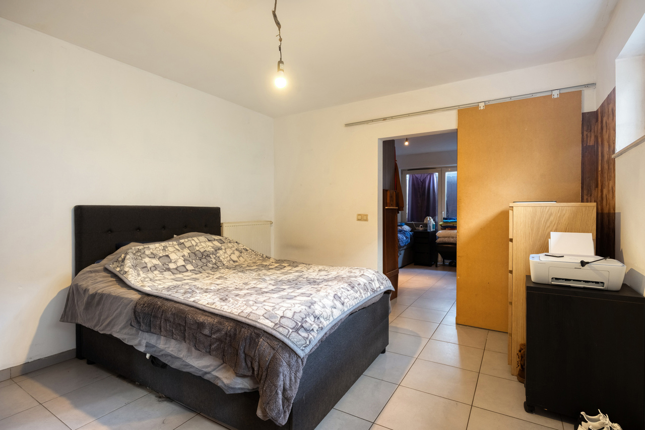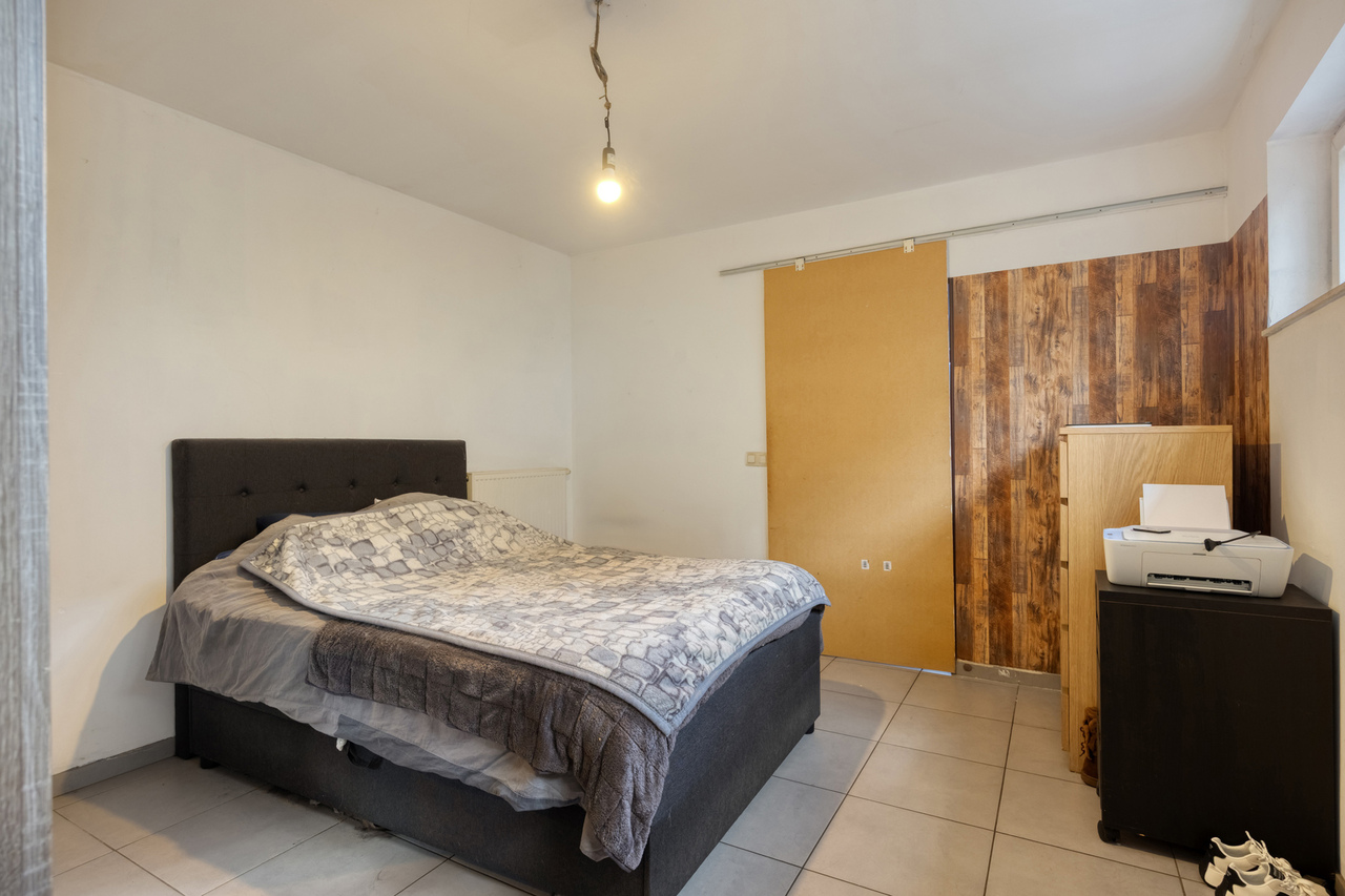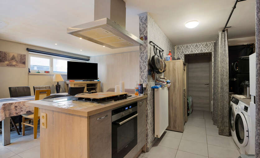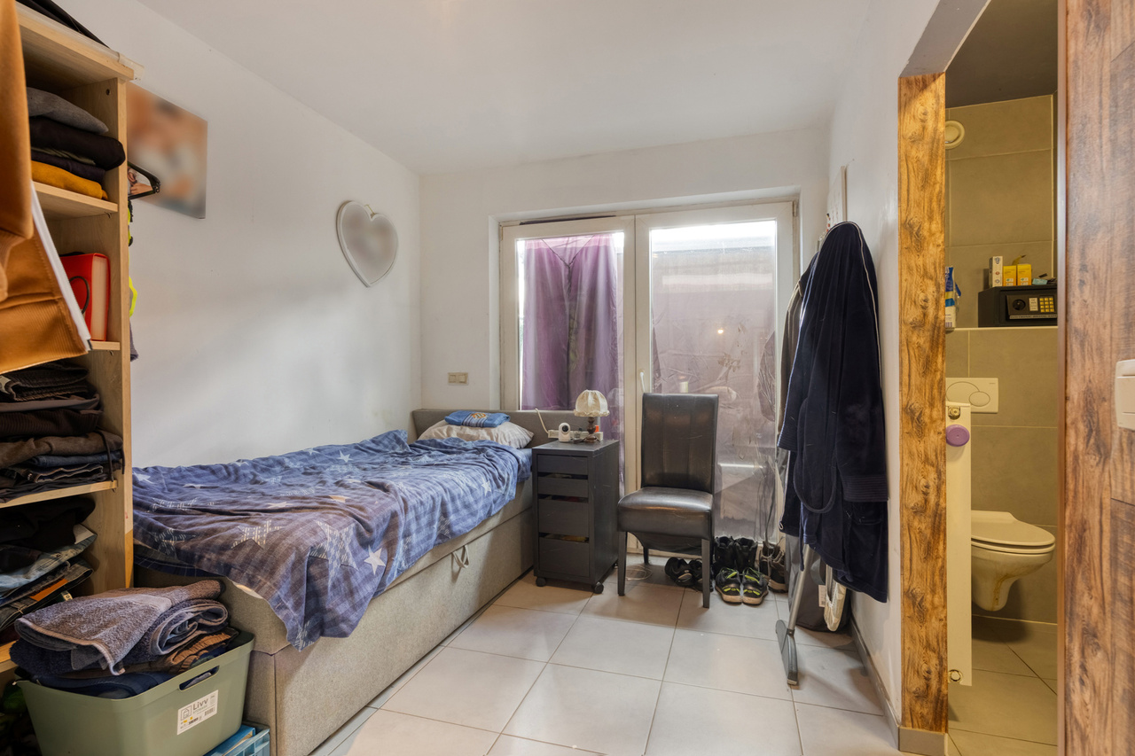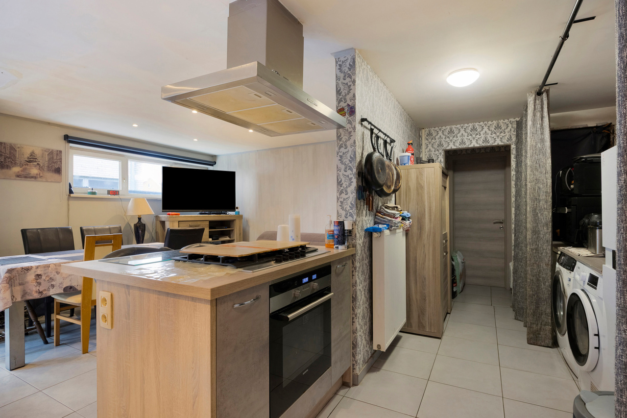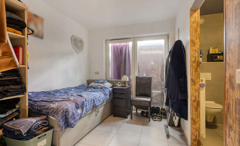Het gelijkvloers omvat een open leefruimte met keuken (kookeiland, inductie, oven, eilandschouw), berging met wasaansluiting en een lichtrijke veranda met pelletkachel en schuifdeuren naar de tuin. Verder twee slaapkamers waarvan de master met dressing en doucheruimte, plus een badkamer. Vooraan bevindt zich een zorgwoning met eigen wc en lavabo – ideaal als kangoeroewoning of praktijkruimte.