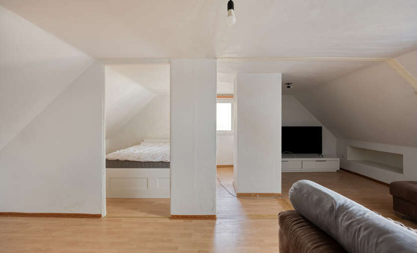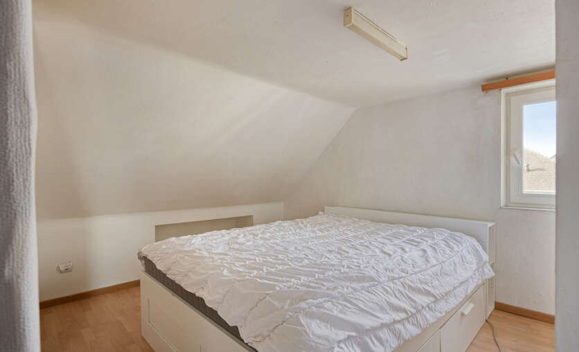 Op de eerste verdieping: twee ruime slaapkamers en een moderne badkamer met stoomcabine, regendouche, dubbele lavabo en toilet. De dakverdieping biedt een grote leefruimte met aansluitende slaapkamer en Velux-dakramen.