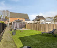 Achteraan een diepe, volledig omheinde tuin met graspartij, overdekt terras met pergola, paviljoen en tuinhuis. Verwarming via Viessmann-condensatieketel en pelletkachel. Zonnepanelen aanwezig. Verharde oprit vooraan.