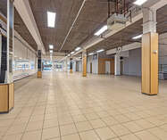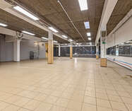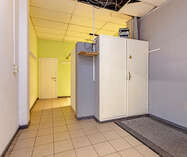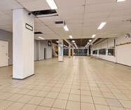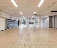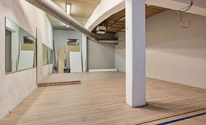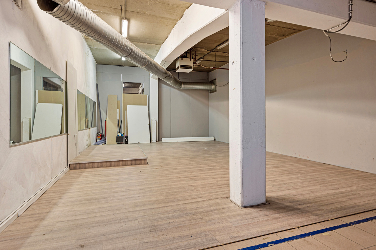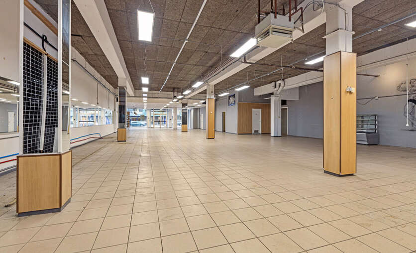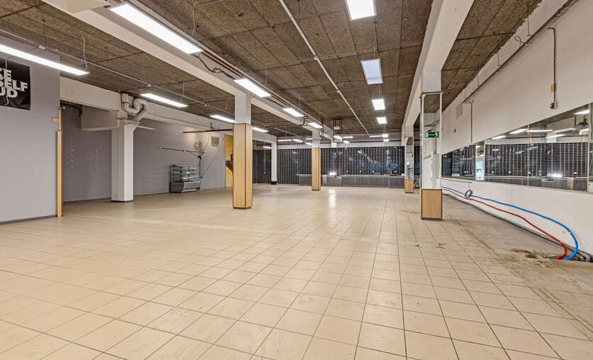 De winkel heeft een ruime voorgevel en een zeer hoog plafond, geschikt voor verschillende doeleinden.